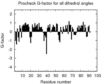 1 With respect to mean and standard deviation for a set of 252 X-ray structures < 500 residues, of resolution <= 1.80 Å, R-factor <= 0.25 and R-free <= 0.28; a positive value indicates a 'better' score